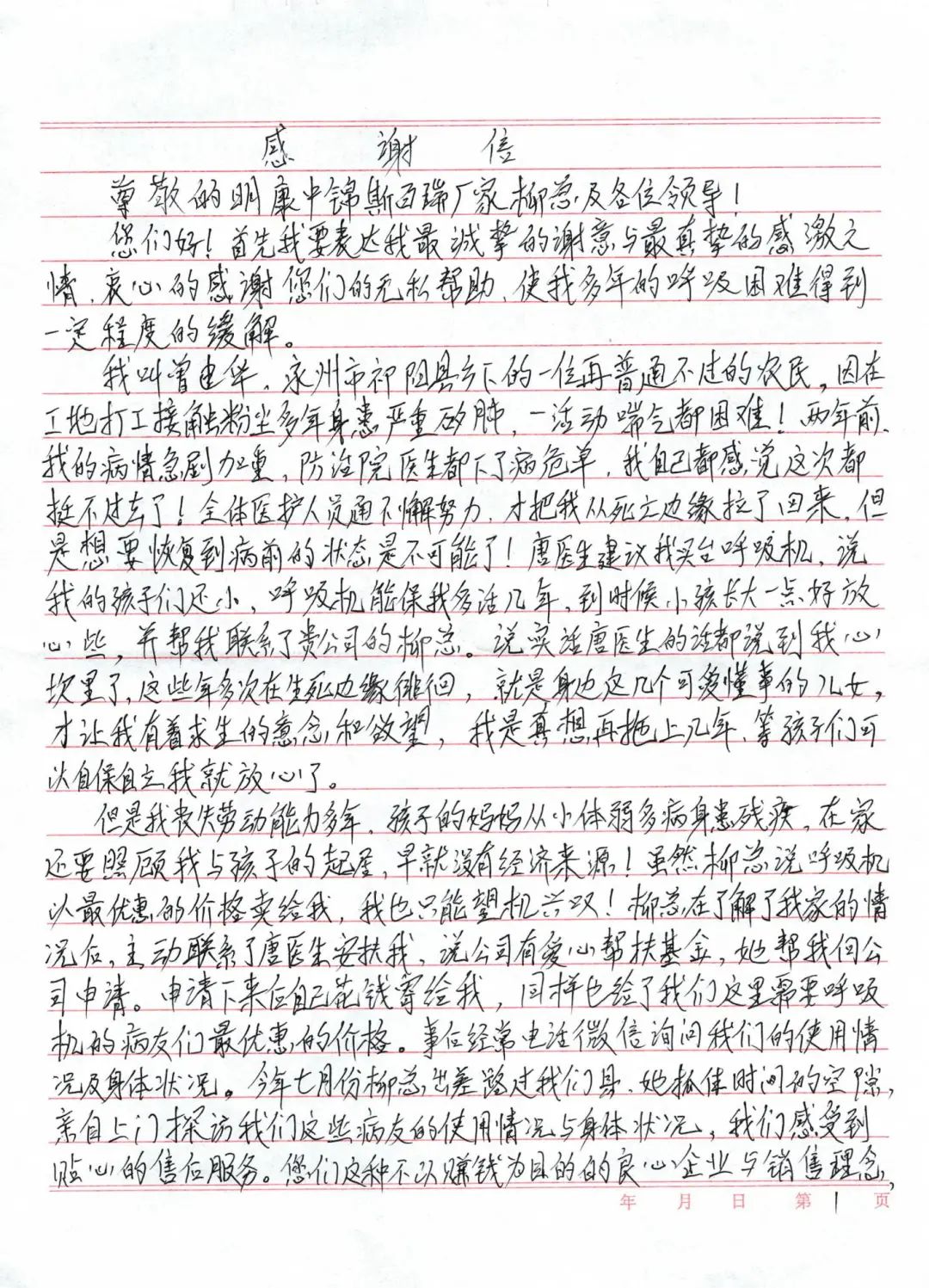 公司当地的销售经理当时了解到曾大哥家中情况后,随即便向公司申请爱心帮扶基金给他免费寄了一台公司的斯百瑞ST-30F无创呼吸机。